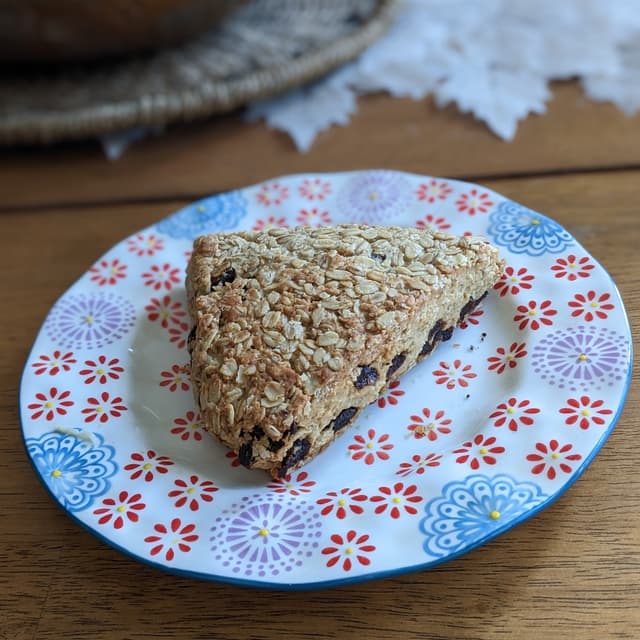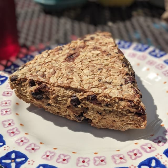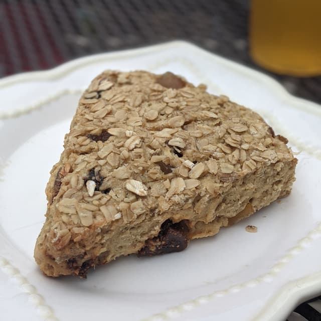 Today's scone flavor is definitely more adventurous than last week's chocolate cherry scone. I enjoyed the originality, but thought it could have been executed better. The fig and chewy candied ginger pieces were presented in huge chunks throughout the scone. I didn't mind biting into the fig, but the ginger pieces got pretty unpleasant for me about half way through. This could just be because I enjoy ginger in moderation. Towards the end I found myself picking out the pieces so I wouldn't have to bite into any more. I would have like it more if the ginger was milder and more mixed into the batter throughout the scone.