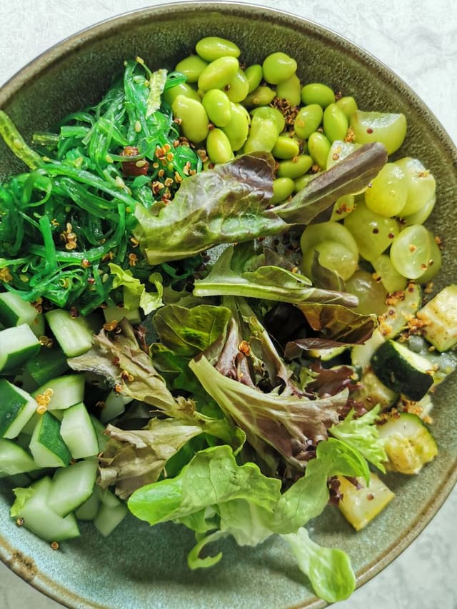Ask for no eggs to make it vegan. It's honestly too light with just edamame grapes Wakame zucchini and some lettuce. If it's just for appetizer it's great. But as main meal too light