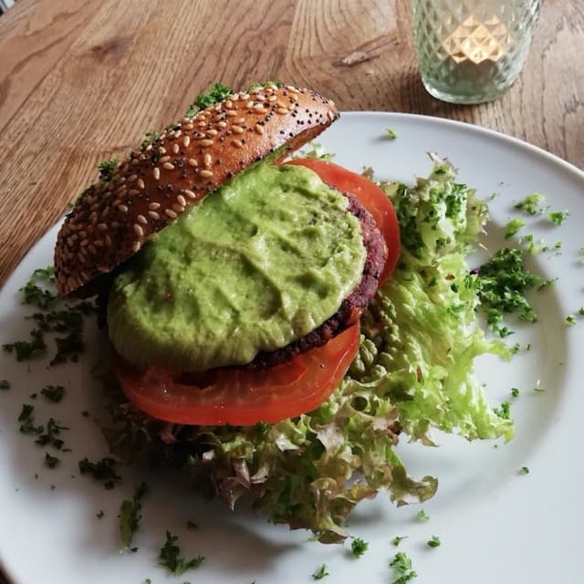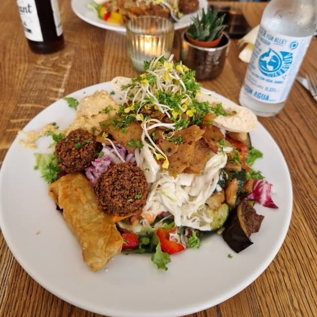 This was a huge and vibrant #bowl/plate featuring a lot! A Hokkaido #pumpkin filled #springroll alongside flavorful #falafel balls and tender hayati (their own vegan #kebab meat). These are accompanied by a medley of roasted #vegetables, tangy weisskraut, and creamy #hummus, all resting on a bed of fresh #salad greens and topped with #sprouts. To complete the dish, there's toasted #bread on the side for a satisfying crunch. It's a harmonious blend of textures and flavors, offering a delicious and wholesome dining experience. All components were so well made, definitely homemade, and tasted wholesome #veganbowl