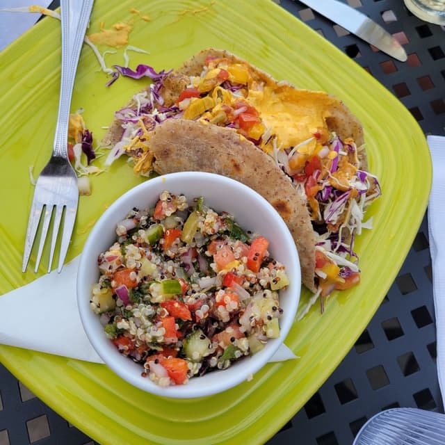 Absolutely loved the Lotus Leaf Cafe-Restaurant on a Mission in Wichita, KS. Supremely cool and friendly staff, wonderfully warm atmosphere and the tastiest of menus. I had such a hard time choosing my entree, but stayed with my cauliflower theme for the evening, lol. My vegan friendly family immensely enjoyed their buffalo cauliflower appetizer ( was gone too fast to get a pic😆) and then I scarfed my vegan cauliflower taco with an incredible tabouli side. Furthermore, I enjoyed their house made vanilla soda as well. Everyone left with a full and completely satisfied belly!!💚💚💚