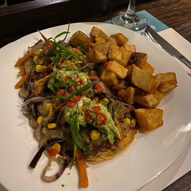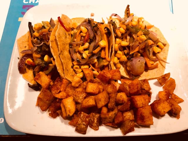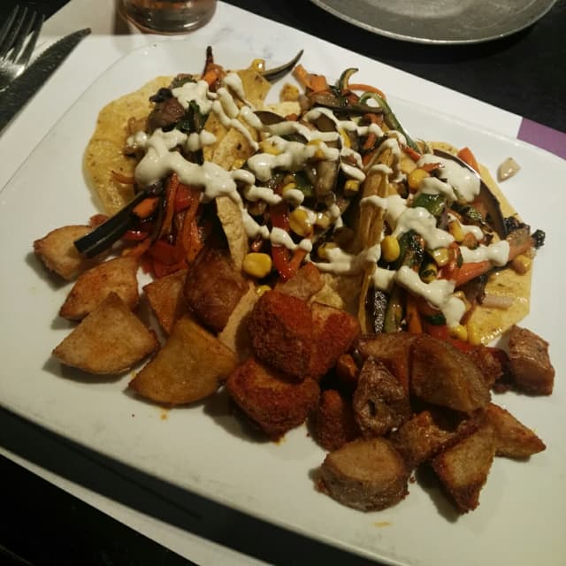 Tacos veggie con modificación de salsa, en lugar de “cremoso de aguacate” pidan con “guacamole clásico”, son riquísimos, súper abundante y a muy buen precio. Los chicos muy amables y dispuestos también con los cambios. Plus: las margaritas son un 10 ☺️
