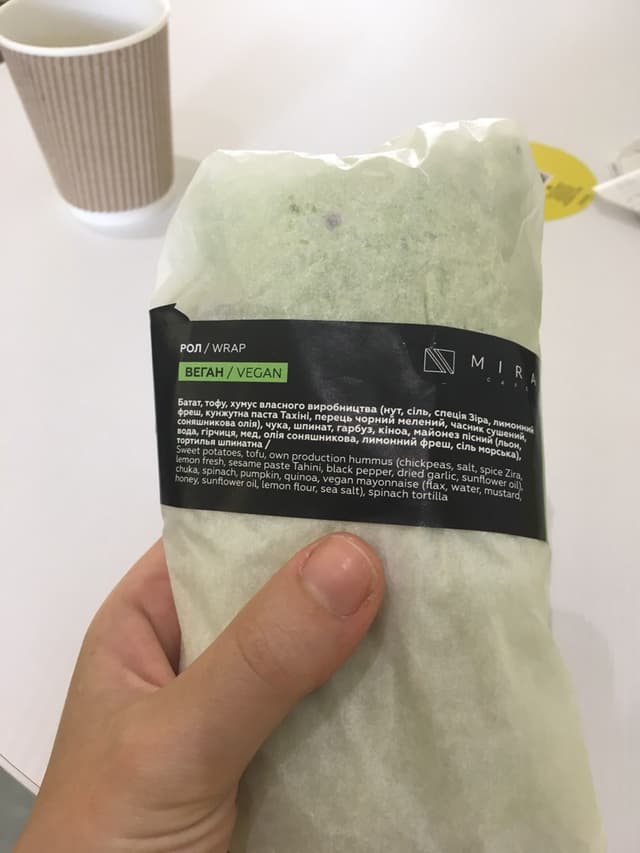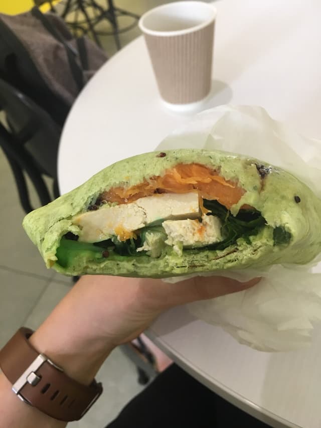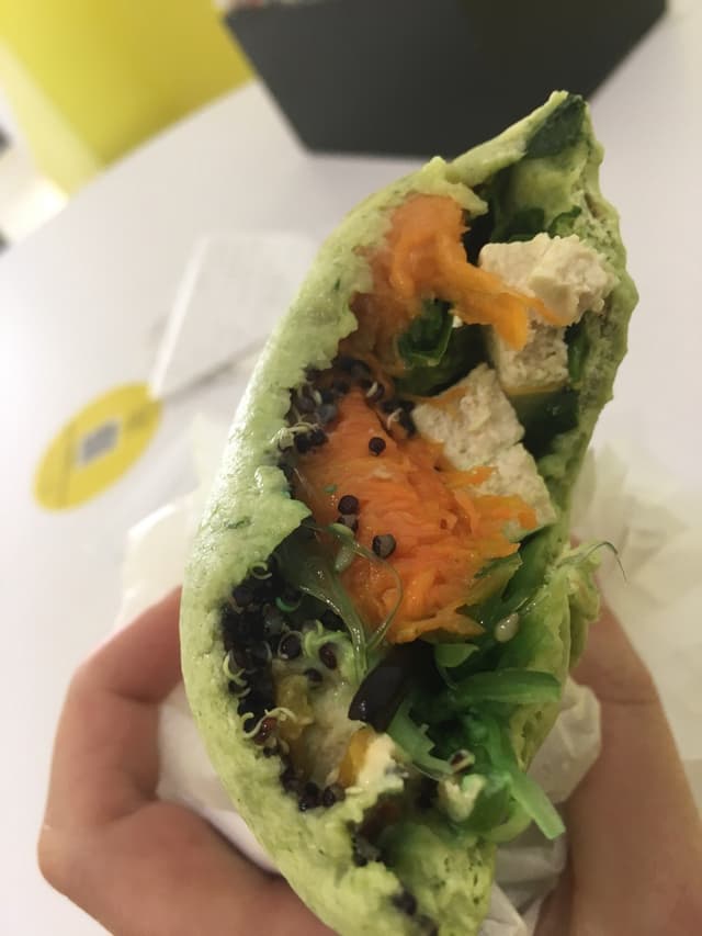 Best wrap I’ve ever had! Pumpkin, hummus, quinoa, wakame, tofu, spinach all in a spinach tortilla. It’s a cafe but all their food comes pre-packaged. Nutritional info on the packs, this wrap has 20g of protein! 576cals. Really delicious, I’m obsessed 😅