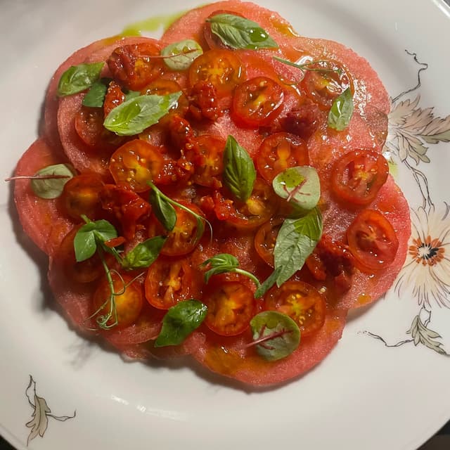 pacioccone159 reviewsUna sorpresa squisita ed inaspettata per il palato!! Un piatto di una fantasia unica!!!Carpaccio di cocomero con pomodorini datteri i e pomodoro confit e con basilico e basilico selvatico