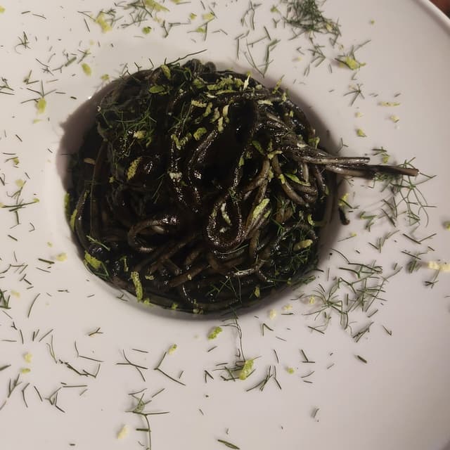 night92225 reviewsIl tocco di classe: il limone! Per i nostalgici un vero ricordo degli spaghetti al nero di seppia, per i ricercatori un piatto sublime! Alghe, carbone vegetale, limone e ingrediente top concentrato di pomodoro essiccato al sole! Il locale è fantastico, non è solo un ristorante! Lo staff è fantastico! Prezzo: 14€Spaghetti al buio
