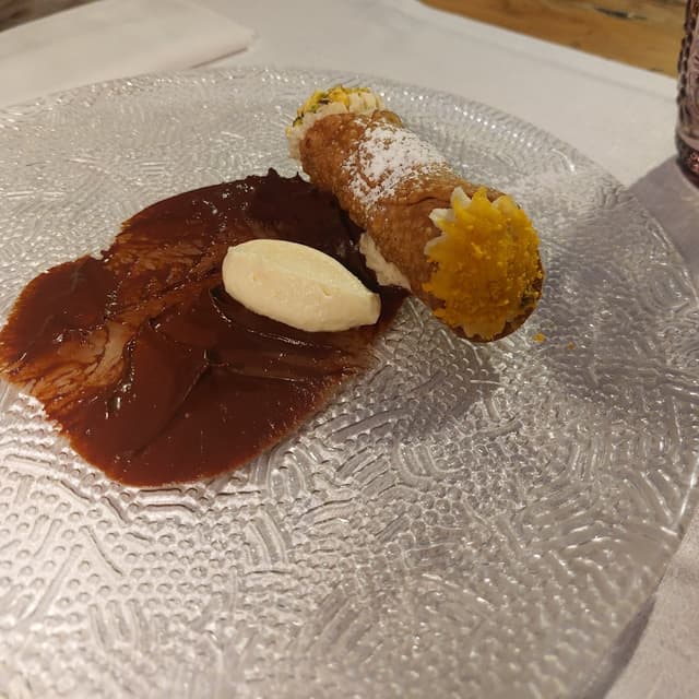 night92225 reviewsE non potevano non inserire il cannolo nel loro menù! Buonissimo, fragrante, con una dolce mousse! Cialda e crema create nel loro laboratorio (eh sì, non è solo un ristorante!) Prezzo: 5€Cannolo Pistacho