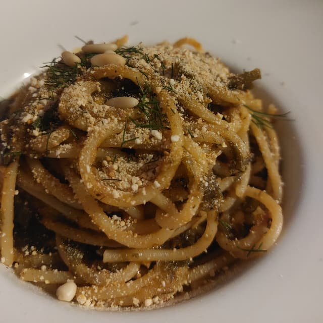 night92225 reviewsSpaghetti con finocchio selvatico, uvetta, pinoli e alghe ed eun trionfo di sapori! Staff simpatico e cordiale, atmosfera ottima! Da tornarci! Prezzo: 14€un tuffo a palermo
