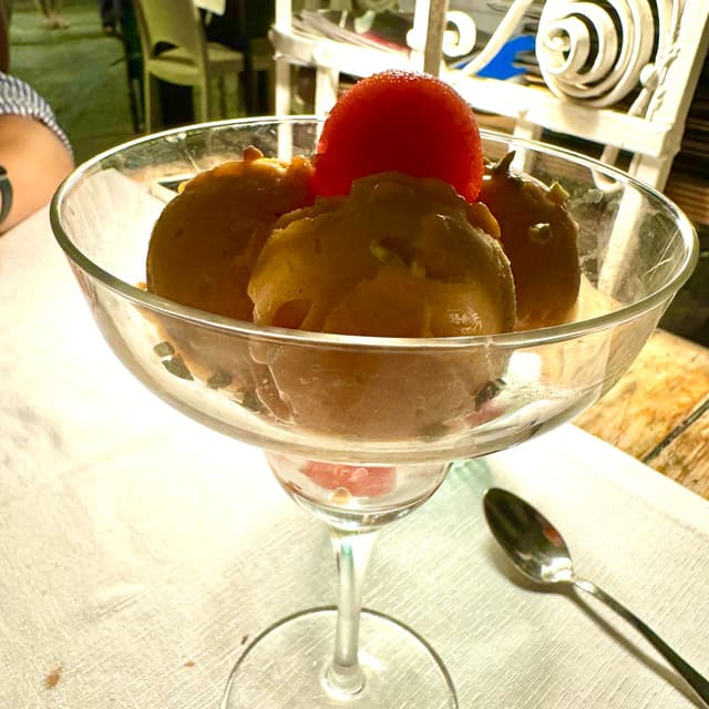 lauramantoan115 reviewsIl sorbetto viene presentato in una coppa di vetro e si consuma con il cucchiaino; appena in bocca, è possibile apprezzare il fresco sapore della frutta con cui è realizzato; accompagnano il tutto delle palline di anguria fresche e dolcissime.sorbetto ai frutti misti
