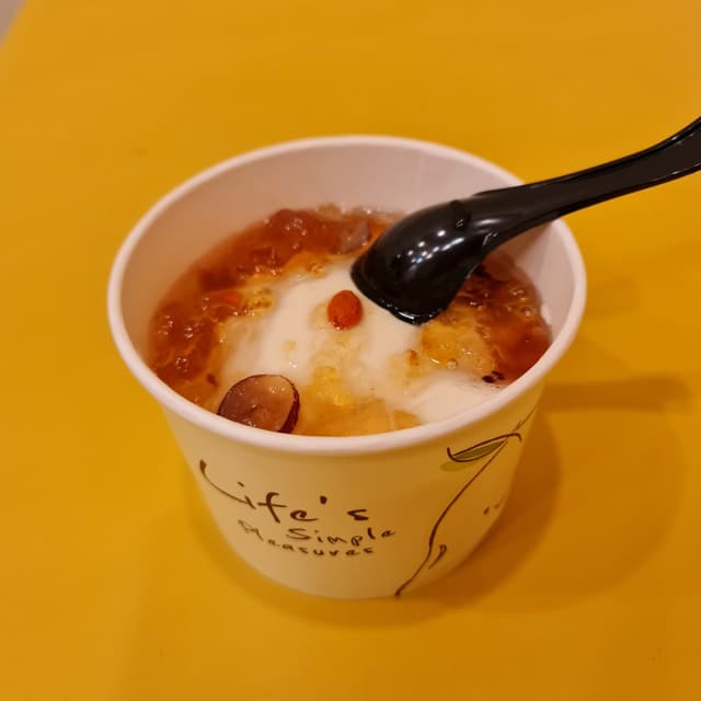 Pricey #festiveeats (for upcoming 2024 八月十五节) @ $4.60 per bowl or $8.20 for 2 with a modest serving of #peachgum, single #goji and sliced #reddates. Black sugar unpictured; was shown a tall (likely syrupy) pump of whatever brown sugar that's presumably in there. Kinda redundant considering there's already some sorta #sweettooth makeup in the mix Location 👉 PLQ #dessert #soy