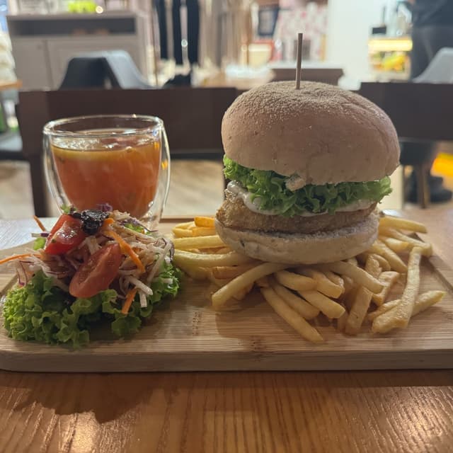 Teng Chu Yu3,572 reviewsVery aesthetic burger set w rainbow colours 🌈 The ‘fish’ seems to be made from soy & konnyaku!Fishless Slaw Burger