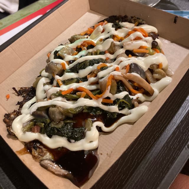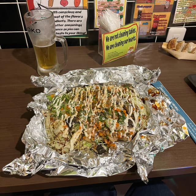 Dinner here was not a meal, it was a whole experience. Let me explain: this is an okonomiyaki restaurant, with a full vegan menu, and a great reputation that brought me here. The restaurant is on the different floors: you order on the ground floor, where the lovely owner takes your order and then prepares it, and in the meantime you can go upstairs and look for a table, then she calls you back through a PA system when the food is ready. The owner is truly lovely and has filled the place with colors and fun, and also many signs explaining her story: she used to have some staff, but it was more expensive and the waiting times were still the same, so she decided to continue the operation by herself, and she kindly asks the guests to clean after themselves when they leave, to facilitate her job. Moreover, while you queue to enter the restaurant and also when you’re sitting at the table you can go fill yourself a glass of beer for only ¥200, that’s incredibly cheap! I had a great night here, made some friends (that beer might have helped) and will forever carry this experience with me 🥰