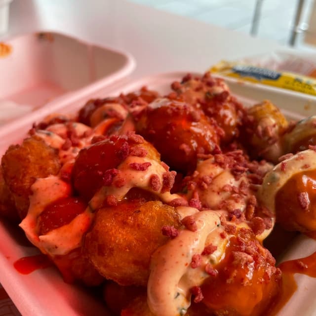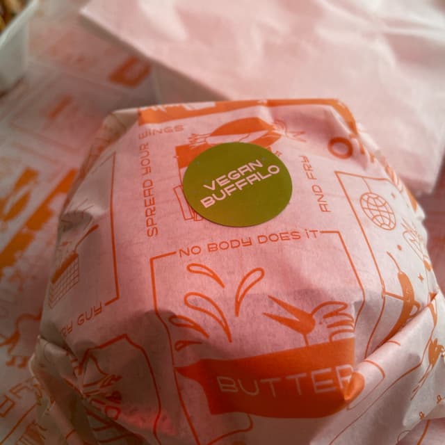 Fried “chickn” patty properly battered, vegan ranch sauce and hot sauce and good old pickles and lettuce. This is not a full vegan spot but the vegan options are amazing! love that I can eat with my partner stuff we both wanna eat 🫶
