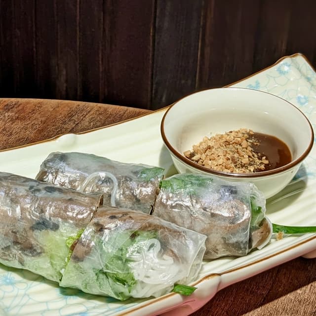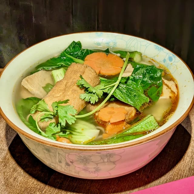 Pho rice noodles in vegan broth with fried tofu, enoki mushrooms, lady's finger, broccoli, cauliflower, bok choy, and carrot. No mock meat. A healthy dish with lots of blanched vegetables that were naturally slightly sweet and thankfully not too hard or undercooked. Served with nutty savoury sesame seed puffed rice cracker on a bed of raw beansprouts - not sure why raw beansprouts were served, as they didn't taste pleasant and thereafter I also found out that it might not be safe to consume raw beansprouts haha. Would have preferred some kind of papaya salad or cabbage slaw instead. (Allium-free, $10.90) #sgvegan