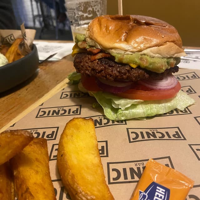 [ESP] La pedimos a domicilio. Hamburguesa vegana con pan artesano de Carral, queso cheddar vegano, aguacate, lechuga, tomate y cebolla. Viña acompañada de patatas gajo y nachos con hummus casero. ¡Muy rica!