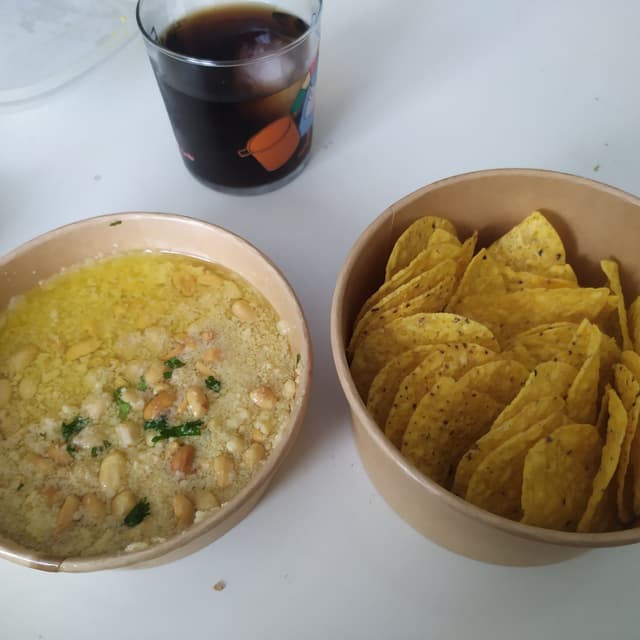 [GAL] Pedímola a domicilio. Hamburguesa vegana con pan artesán de Carral, queixo cheddar vegano, aguacate, leituga, tomate e cebola. Viña acompañada de patatas gajo e nachos con hummus caseiro. Moi rica!
