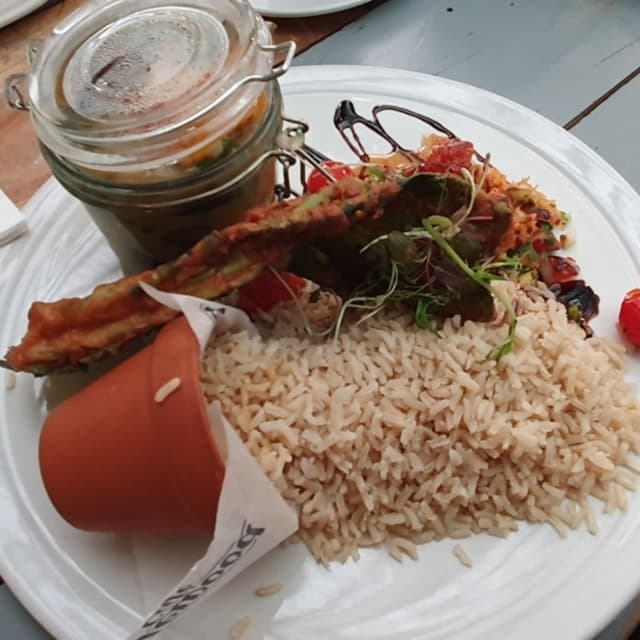 Vegan Thai Green Curry: Coconut, lemongrass, ginger, garlic, green chilli, lentils, chickpeas, tomato, brinjals, green beans, salsa, brown rice, sweet tomato jam, spinach tempura * such a nice setting, very delicious dish, packed with flavour, great presentation... sadly the prices at Sagewood has become so high its unaffordable for the average person 😔 *