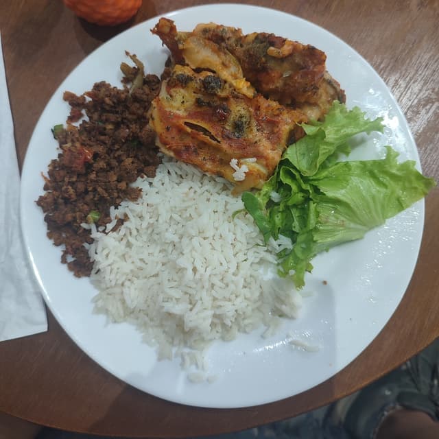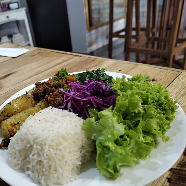 ericunga653 reviewsEl lugar ofrece comida vegana. El menú ejecutivo de ese día era arroz , papas asadas, lechuga, proteína de soja y repollo colorado. Muy rico y variado.Menú Ejecutivo