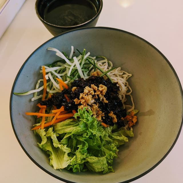 Steven Neoh7,845 reviewsThis #zhajiangmian doesn't pass the would-bring-a-sceptical-omnivore test for me ☹️ The #noodles were too sticky and clumpy, which made it difficult to mix the stuff in. At $7.50 not exactly cheap, so overall an underwhelming effort 😐 I did enjoy the #fakemeat #mince, in isolation 🙂炸酱面 Zha Jiang Mian