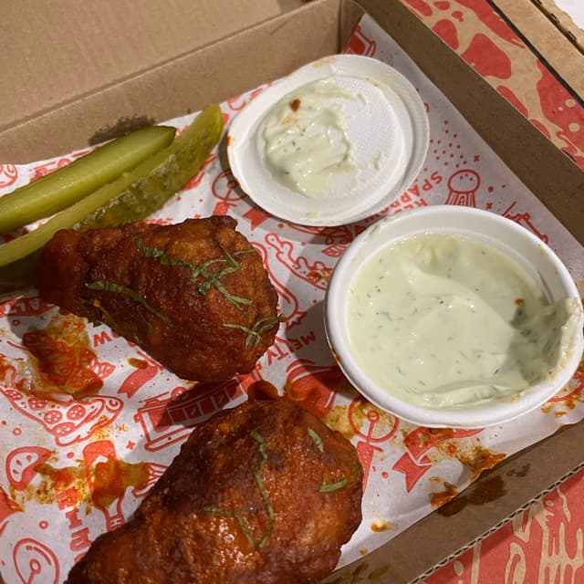 Honestly … I have no words. Not only were these the BEST not wings I’ve had in my life, this might actually be one of the best dishes I have tried. Period. It was spicy (had mine with the hot sauce) and the pickles and dip were the best combination for the dish. Omg Im in heaven!