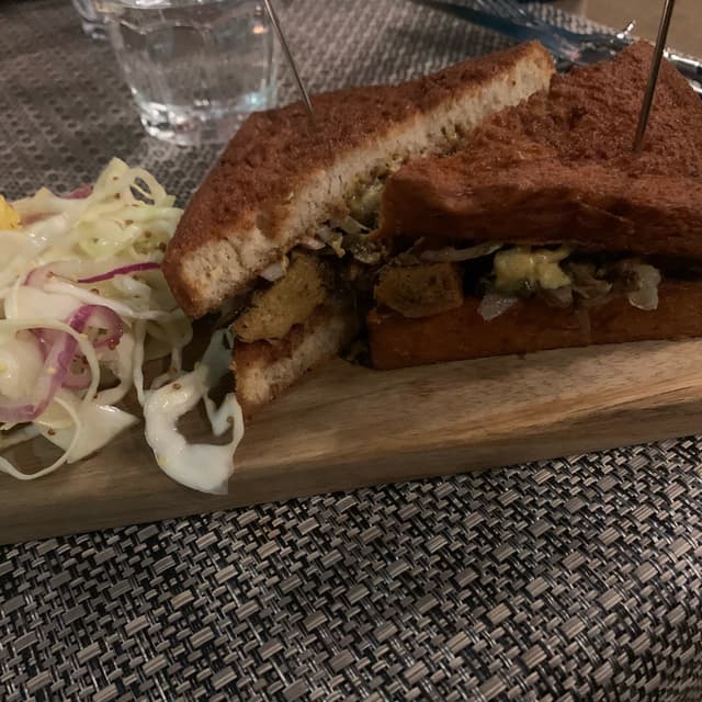 bebibi470 reviewsMolto speziato, classico gusto orientale che io non amo ma tra il loro seitan (che mangerei in tutte le salse) e il pane che smorza un po’ il sapore, è un piatto ben bilanciato. Il Caleslaw rinfresca tantissimo.French toast con jerk di funghi e seitan, salsa all’ananas arrosto, senape e slaw fusion caraibico