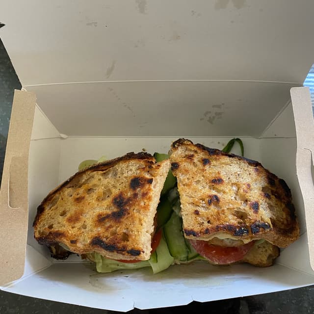 Falafel, greens, tomato, avo, cucumber, hummus, pesto mayo on sourdough The sourdough was tasty, but the filling lacked seasoning. #falafel #sandwich 💰R80