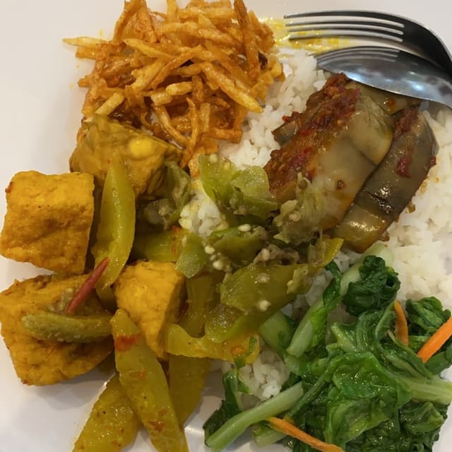 Poppy216 reviewsVegan buffet present in Kalimantan cuisine with jackfruit curry, chillin potato, and rice. #veganin2020Nasi campur