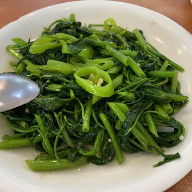 Poppy216 reviews"Cabe ijo" edition, fresh kangkung for the lunch time. Very affordable #veganfood #plantbasedStir fry Water spinach