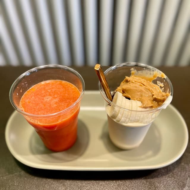 Yogurt di soia con banana, cioccolato e burro di arachidi accompagnato da un estratto di arancia, carota e limone. Una delle mie colazioni preferite, buonissima!