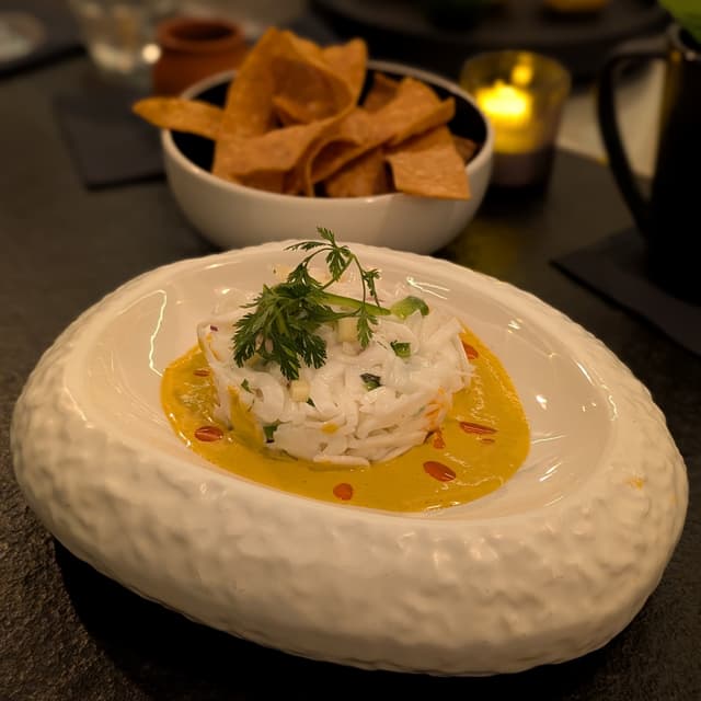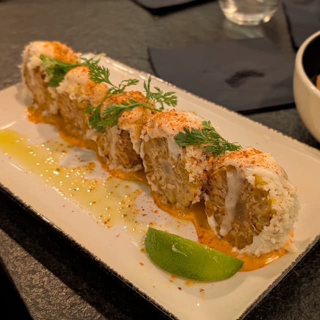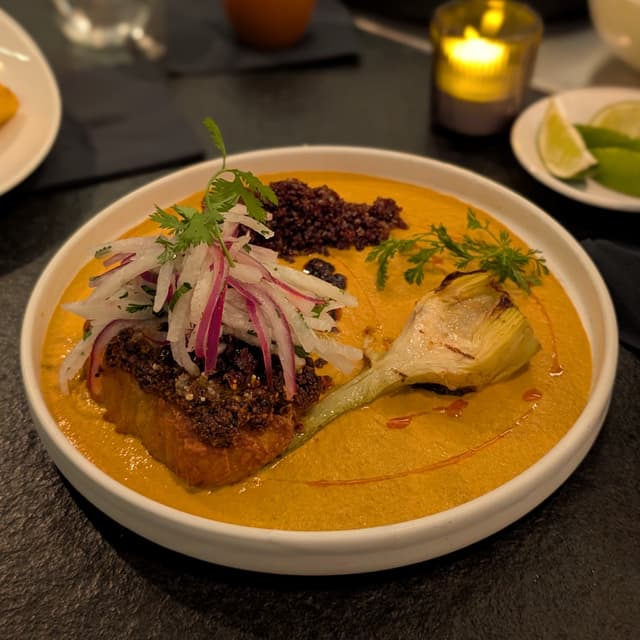 Wow wow wow. Chef Guy Vaknin has done something incredible to make this salmon. This is the most realistic vegan fish I've ever had. I avoided seafood even as an omnivore (although I must have had salmon at some point), but this is exactly how I imagined salmon's texture and taste. Tbh, it's not for me. It was just a bit too fishy, but I truly am so impressed. I hope more dishes like this can help pescatarians move on from eating out aquatic friends. This flakes apart so easily. My best guess is it's layers of palm or banana blossom pressed together into this steak. It also has to be marinated in seaweed and other seasonings for the taste, and maybe beet juice for the pink color. Even though I'm not a fan of fish, I was drawn to this because of the sikil pak. I fell in love with sikil pak two years ago when I was last in NYC. I had it at Jajaja and loved the spicy, nutty, pumpkin seeds salsa. The salmon here is topped with sikil pak then loaded with a generous amount of onion. It's also served with quinoa and artichoke in a pool of flavorful sauce. The sikil pak didn't provide the flavor I was expecting. It was more charred, so I didn't get that pumpkin seeds flavor. Overall a really cool dish, but I personally wouldn't get it again because they did too good of a job making it like actual fish flesh. I'm so impressed though. @jonok sure liked it and he grew up eating more salmon than me, so trust his opinion if that also reflects your past! #vegansalmon #veganfish #fisharefriendsnotfood #veganseafood #sikilpak #artichoke #veganmeat #quinoa #redonion #cilantro #pumpkinseeds #mindblown #mexican #finedining #newyorkcity #nyc #manhattan