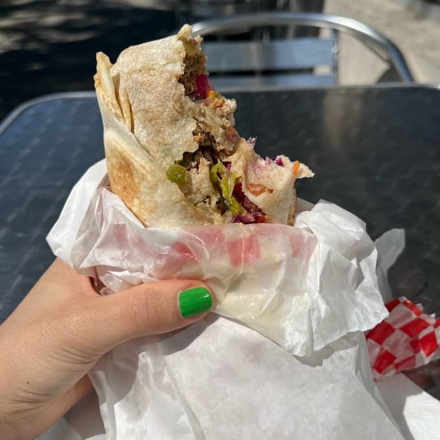 Questo ristorante/gastronomia vegana è veramente fantastica. Ti fanno panini e piatti vegani sul momento con ingredienti a scelta. Questo wrap aveva del finto pollo fatto con i funghi salsa teriyaki hummus e verdure. Piccolino ma soddisfacente