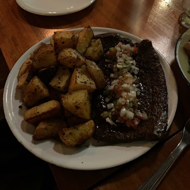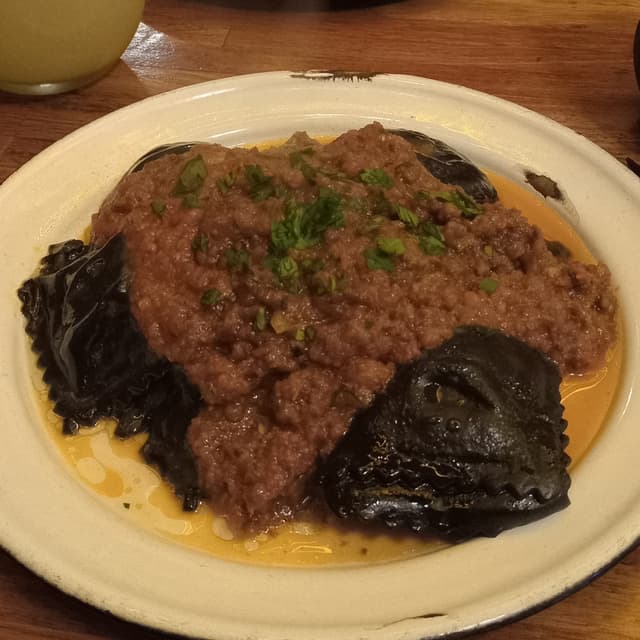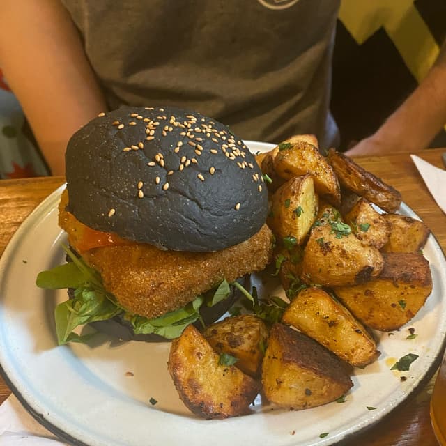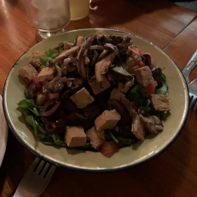 Relleno con saltado de verduras, seitán y cebolla frita. Riquísimo, muy buena porción. Podes acompañarlo con papas al horno, fritas o batatas fritas