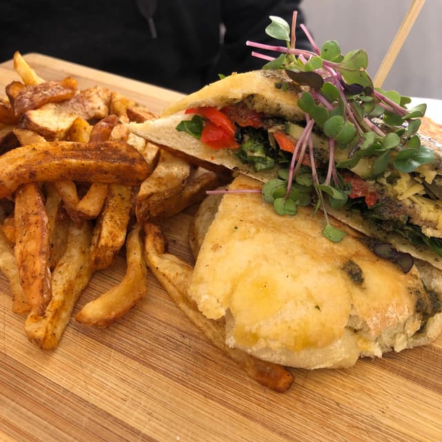 With vegan pesto, chargrilled veggies, spinach and pickled jalapeños. And a side of fries. Very delicious! Perhaps a little pricy at R150 but I usually find the prices to be higher on a wine farm
