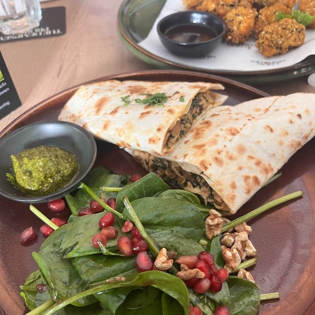 This quesadilla is deceivingly good! As a former vegetarian and someone that loved cheesy gooey quesadillas in the past, I wasn't really sure how this would work but the vegan option was absolutely incredible, not too mention how they manage to put so much into the quesadilla without it falling apart! Brilliant!!!