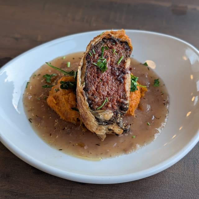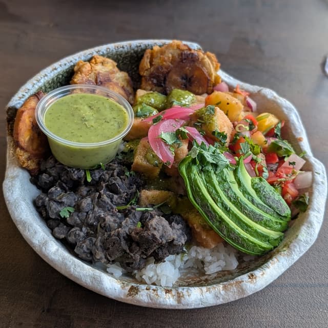 This was my pick to balance the wellington. I love a good rice and beans bowl, but the tostones (fried plantains) really sold it for me. This is such a delicious, fresh, and nourishing dish. It originally comes with non-vegan carnitas, but they swap that out for tofu. They asked if I wanted regular tofu or coconut tofu. Coconut sounded like it would go best with this tropical bowl, so I went with that. It was really great! I would definitely get this bowl again. The full list of goodies in this bowl is: coconut tofu, black beans, pineapple pico de gallo, avocado, tostones, cilantro, pickled red onion, mojo sauce, and coconut rice. #bowl #rice #beans #blackbeans #riceandbeans #avocado #plantain #picodegallo #pineapple #coconut #tofu #tofulover #protein
