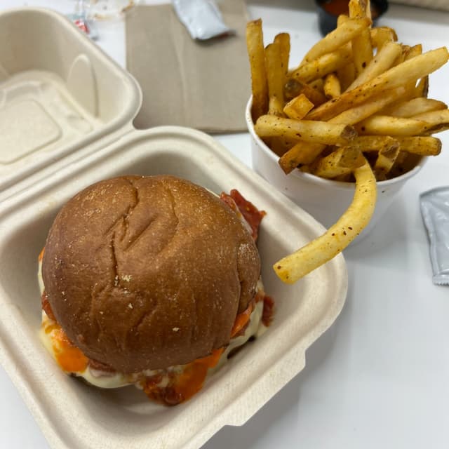This is my go to burger at my go to vegan restaurant. This burger has great taste, texture, and is pretty filling. They also have a lot of other great options like vegan nuggets, cheese fries, kombucha, and great desserts.