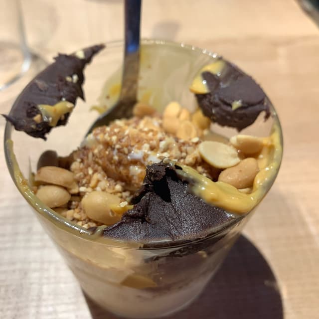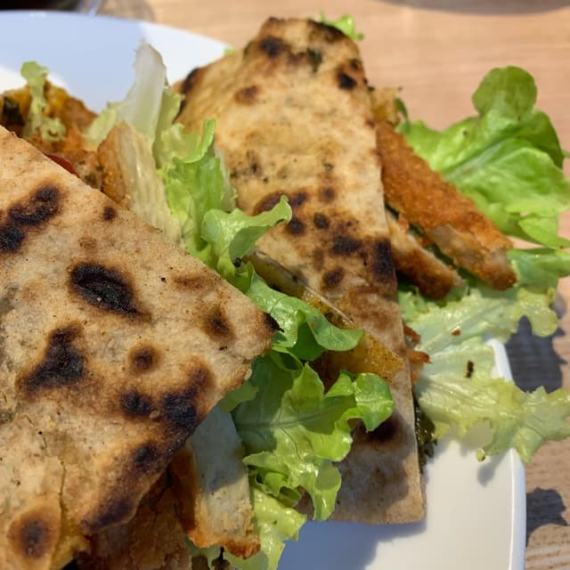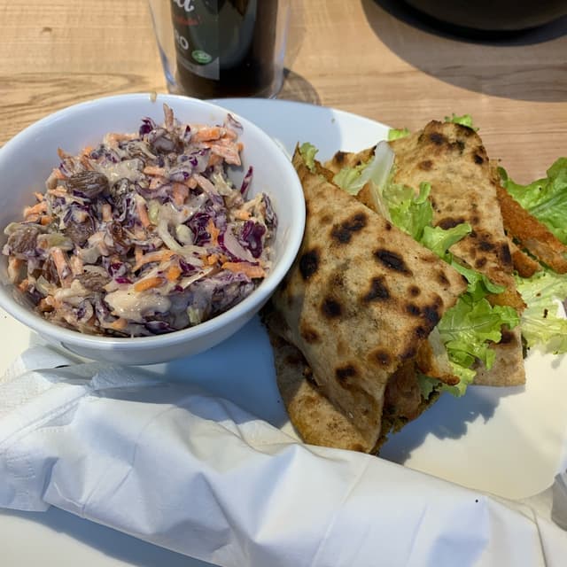 Galette chic Milano, au pesto, tomates cerises, salade, escalopes végétal. Très bon goût, original comme goût. Servie avec du coleslaw très bon aussi. En dessert, un snickers glacé au chocolat maison, caramel maison, pralinés et cacahuètes. Le tout préparé sous ses yeux, un régal ! Et bien entendue dans une vaisselle réutilisable dans une super ambiance :) et en plus le gérant est un anglais super sympa toujours avec un sens de l’humour unique 🤪