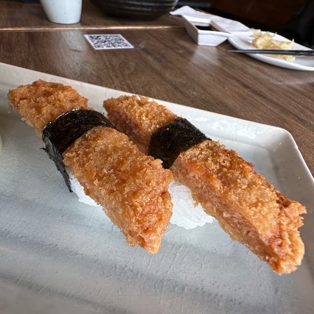 Patrick L. Williams103 reviewsReally awesome! Textured vegetable protein fried like a cutlet and presented Musubi style, on a rice bed with a seaweed ribbon.Vegan Spam Nigiri