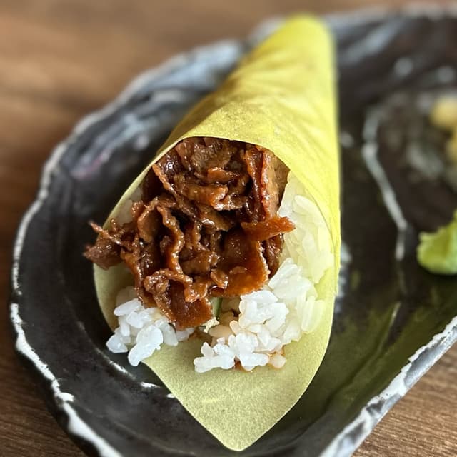 Patrick L. Williams103 reviewsTextured soy protein, cucumber, soy wraps. Very realistic vegan version of teriyaki.Beef Teriyaki Hand Cone