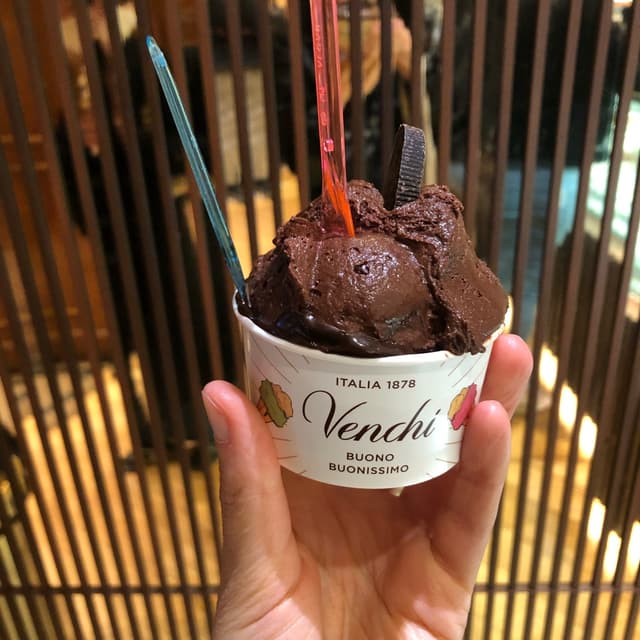 Gelato al cioccolato fondente, sapore super intenso. Accompagnato da crema di nocciole e cacao e un cioccolatino fondente. Tutto certificato vegano.