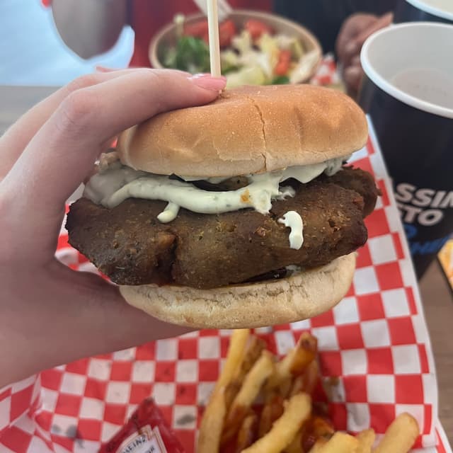 Bun del mese farcito con hamburger di felafel homemade, yucca fritta, menta e cetrioli. L’ho amato (forse un po’ piccolino). Ogni panino viene accompagnato da una porzione di patatine fritte.