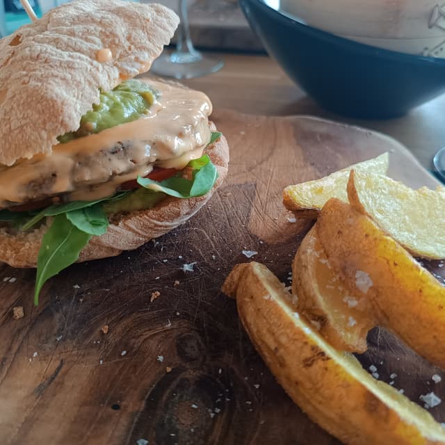 esther7473 reviewsHoy hemos comido una de las recomendaciones fuera de carta, hamburguesa vegana con toque de trufa, guacamole, tomate y rúcula, en pan de chapata,acompañadas de patatas , todo un aciertoHamburguesa Trufada