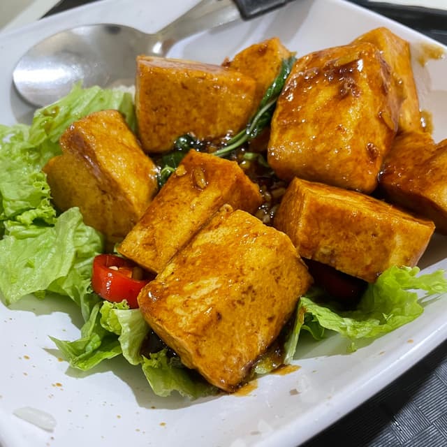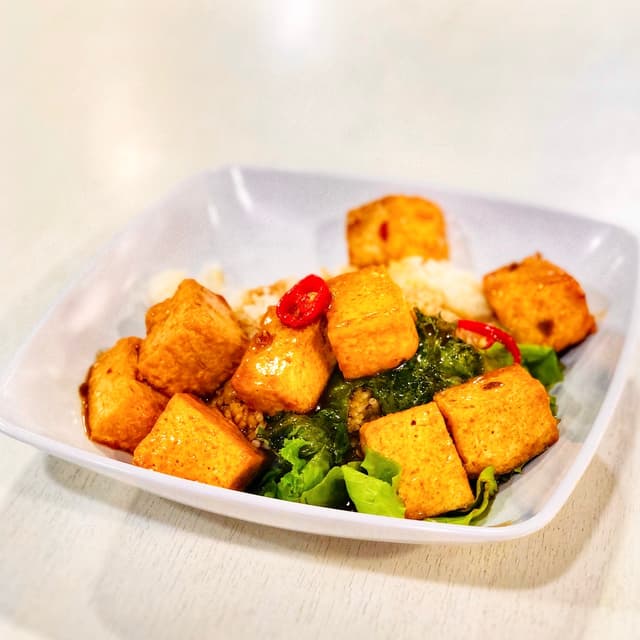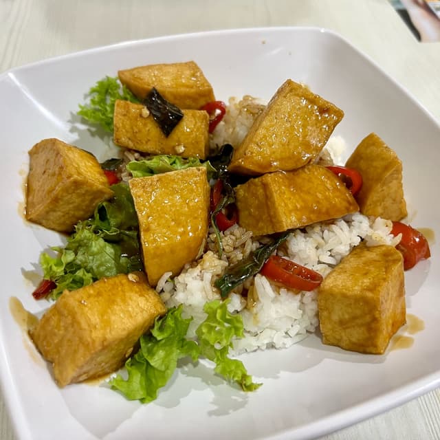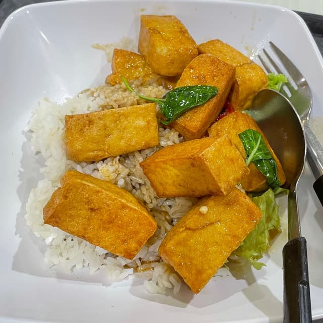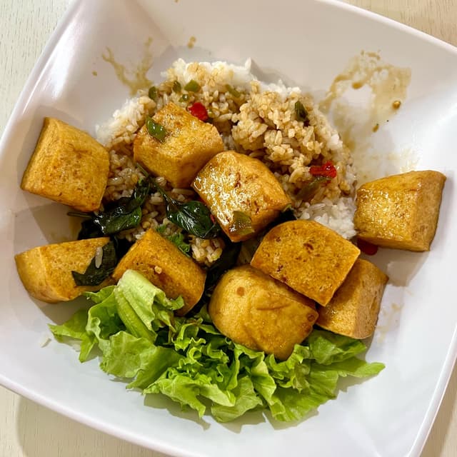 Great to see one of the dishes from veganuary still being offered in November! Generous portion of tofu cooked in a thai basil sauce. Served with rice and a small portion of lettuce. Paid: $3.50 #nuseats