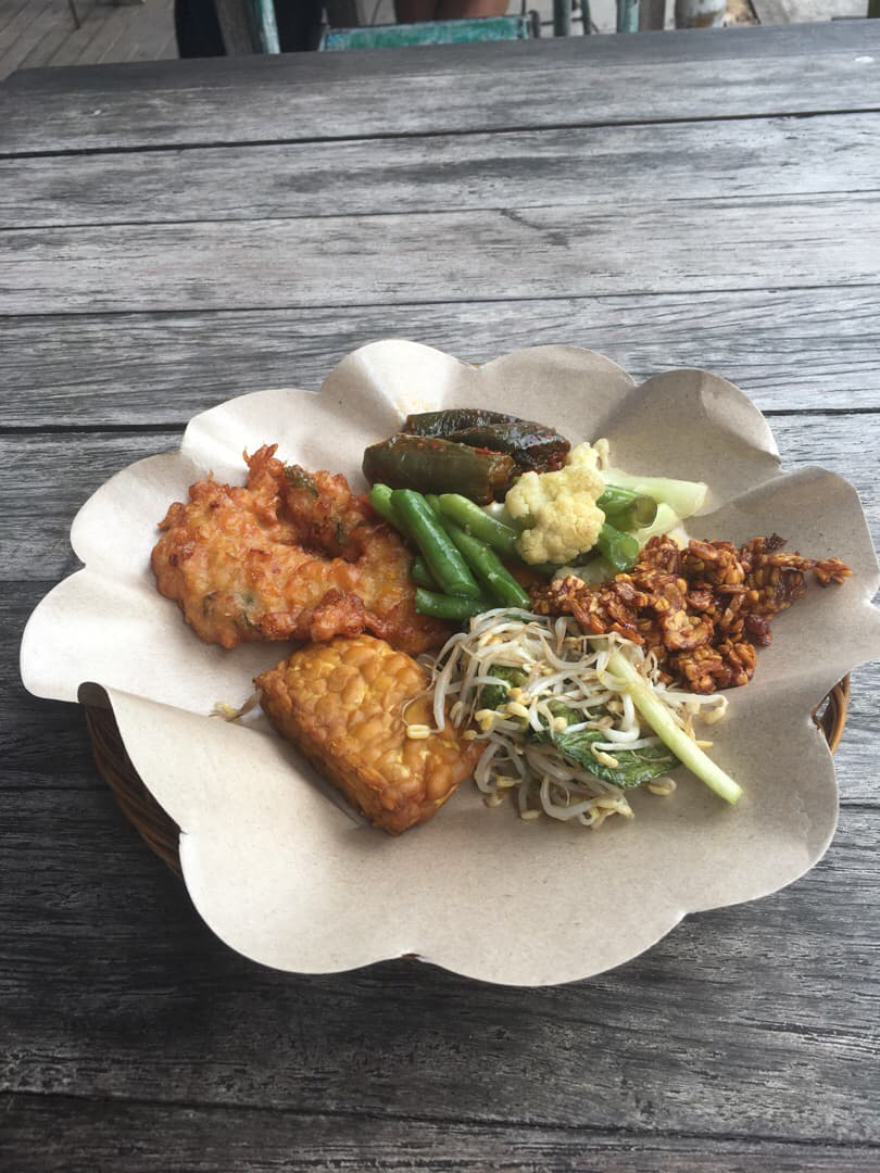 This is a traditional Indonesian buffet, but catered to tourists so it’s a lot cleaner and fresher than the really local places. They serve meat and vegan dishes. You serve yourself so you just grab a plate and scoop on what you want. Super cheap, this plate cost me 15k (1 USD). Good if you want to try the local food but don’t want to get too adventurous. #Indonesian #buffet