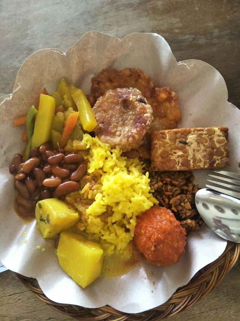 Vegetarian cos I took an egg but there are plenty of vegan options available like tempeh and curry veggies. Nervous about the cleanliness because of the flies so hopefully we don't get sick. Was tasty and cheap! Got all this for only $2.80. my fav were the corn fritter and tempeh :D according to @meowmeowfuzzyface the beans tasted off but unfortunately I had already eaten quite a bit of them so hope my tummy will be ok 😂🙏