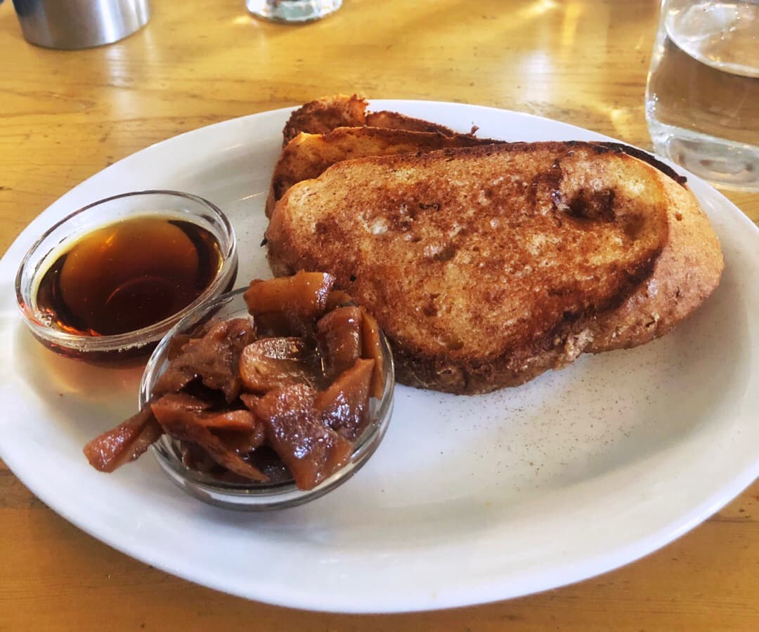 I was pleasantly surprised by this vegan french toast with caramelized apples & maple syrup - SO good! To think this bread is gluten free is mind-blowing! So light & fluffy! This celiac is very happy! I’m not much of a sweet breakfast person, but I will DEFINITELY be purchasing this dish again 😋
