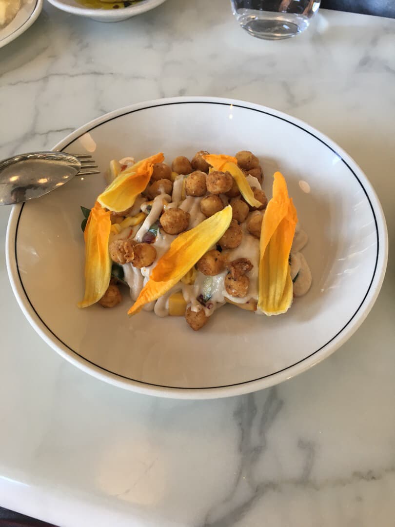 This is the best vegan dish I have ever had. Tasty flavours from the tahini-based dressing, chill oil, roasted chickpeas, zucchini, zucchini flowers, and basil. Otherworldly balance of soft, complex, and clean flavours and textures. Exquisite.