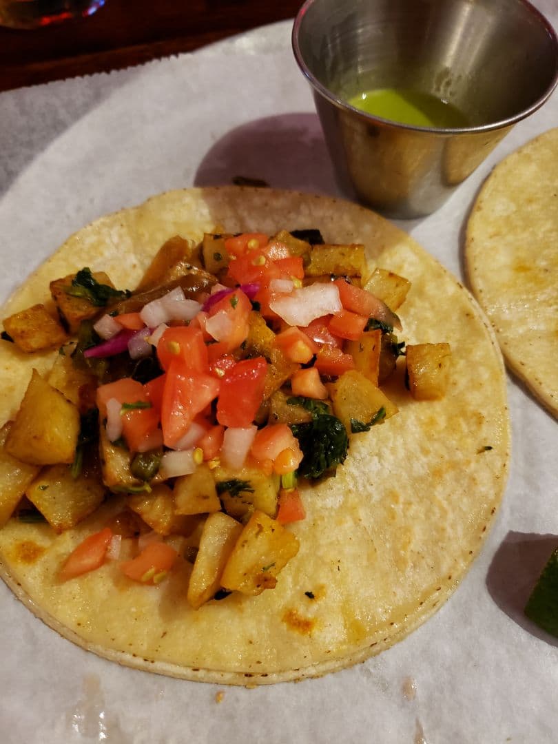This place was great - cool, affordable, and two of their 8 or so taco options could be made or already are vegan. Sides of beans and rice also available and other vegan apps. This veggie potato corn taco was amazing sans queso. I actually ordered a second one even though I was full!