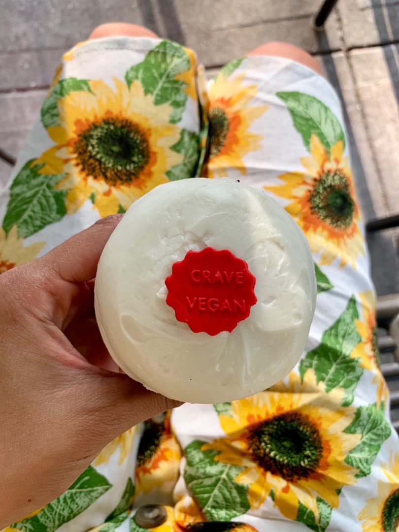 Luscious cream cheese frosting and cute little button to signify vegan! We called ahead and they had just 2 vegan cupcakes left that day, so I had to claim this one. Very creative designs but red velvet is their only plant-based cupcake