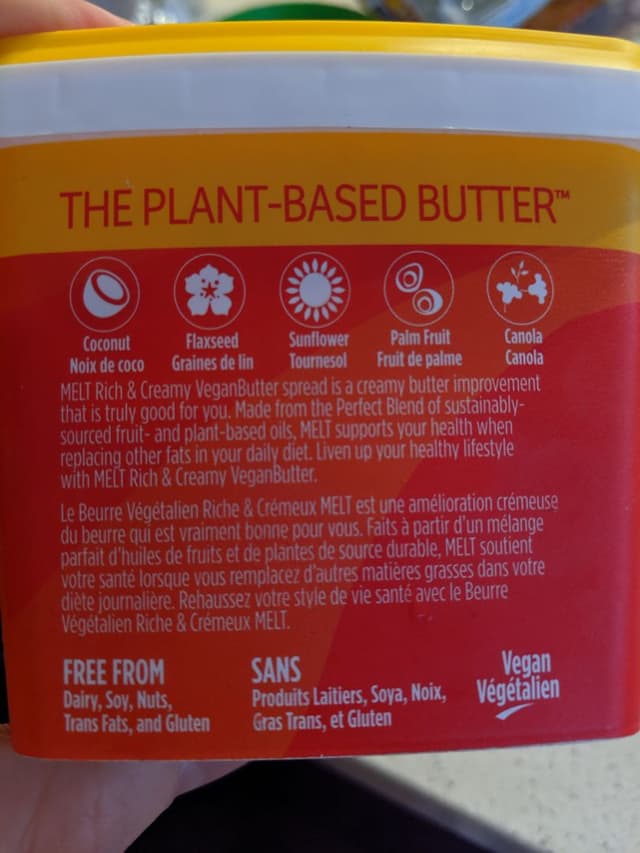 Melt Organic is made from the Perfect Blend™ of fruit- and plant-based oils. It’s dairy-free, vegan and features certified organic, non-GMO virgin coconut oil – a stable, saturated fat, and a rich fruit-based source of medium chain fatty acids (MCFAs). It cooks, bakes and melts just like butter, but with half the saturated fat and fewer calories. Rich & Creamy Melt is a rich source of ‘good fats’ with an ideal balance of Omega-6 to Omega-3 ALAs.