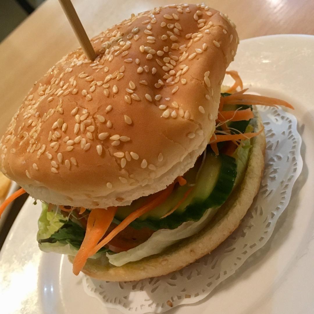 Tasty burger made with mock chicken and fresh salad on a sesame bun.