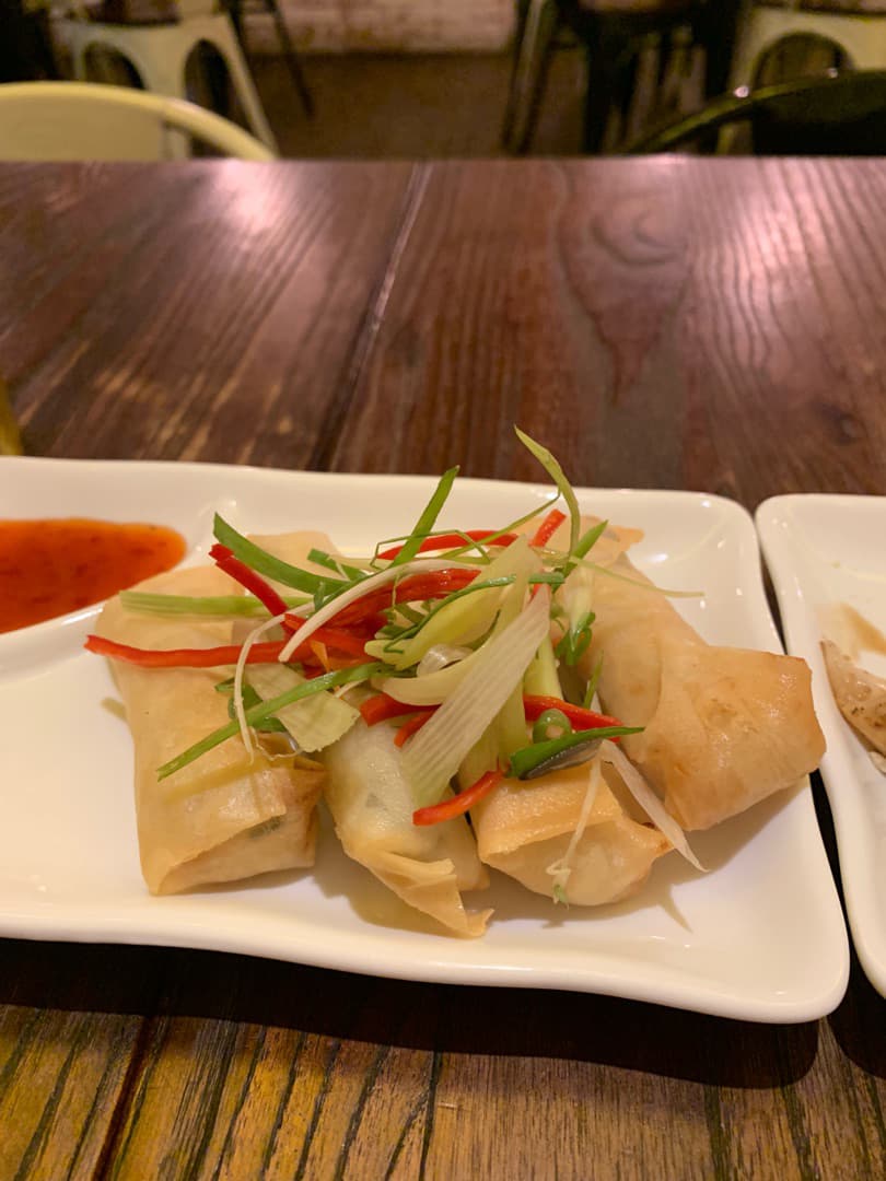 A tasty side dish, just tastes like a spring roll with tofu as the filling. Nice sweet Thai style dipping sauce.